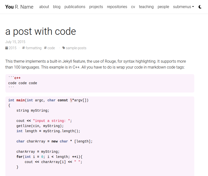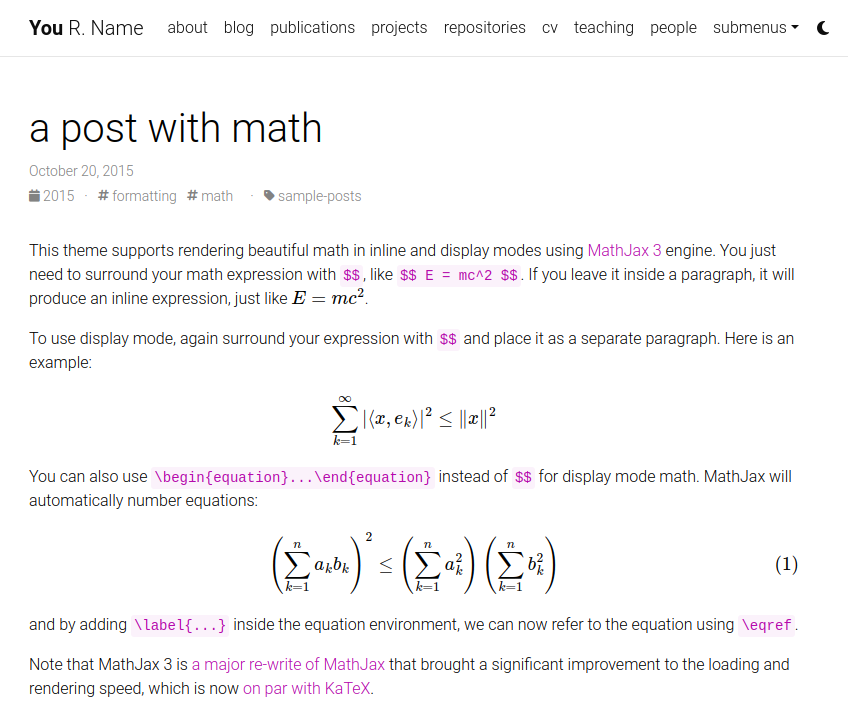 al-folio supports fast math typesetting through MathJax and code syntax highlighting using GitHub style. Also supports chartjs charts, mermaid diagrams, and TikZ figures.